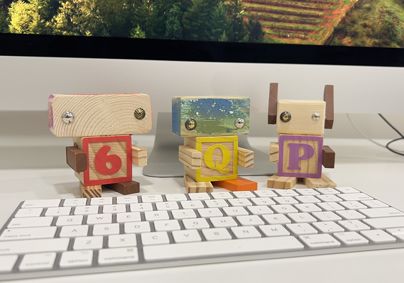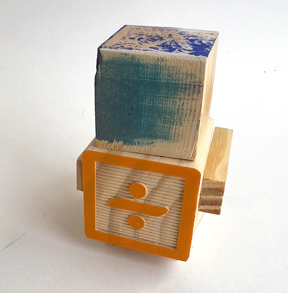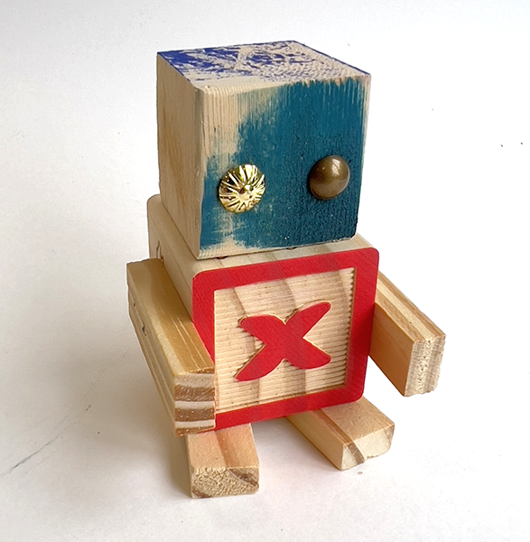 Handmade sculpture using a variety of materials including wood, metal parts, and paint.